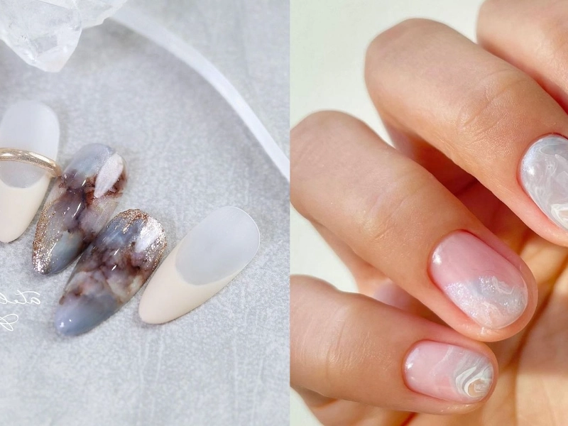 Erzielen Sie mit der wasserfreien Methode in Minuten verblüffende Marmoreffekte. Beginnen Sie mit einer Grundfarbe und fügen Sie dann kleine Punkte oder Linien in einer Kontrastfarbe hinzu. Verwirbeln Sie die Farben, bevor sie trocknen, mit einem Zahnstocher oder kleinen Pinsel, um marmorähnliche Muster zu erzeugen. Probieren Sie für eine schnellere Alternative Marmor-Nagelsticker oder verwenden Sie eine Stamping-Platte mit Marmormotiven. Arbeiten Sie zügig, solange der Lack feucht ist, um das Muster nicht zu sehr zu bearbeiten. Marmormuster sind von Natur aus unregelmäßig – nehmen Sie die natürliche Schönheit jedes Designs an. Für einen raffinierten Marmoreffekt mischen Sie metallische und cremige Lacke; für ein modernes Update probieren Sie kräftige Farbkombinationen. Um Tiefe zu verstärken, setzen Sie kleine Akzente mit weißem oder metallischem Finish. Erzeugen Sie mit der "Dragging"-Technik, bei der Sie einen Zahnstocher sanft über feuchten Lack ziehen, subtile Aderungsmuster. Versuchen Sie, mehrere Töne derselben Farbfamilie miteinander zu verwedeln, für einen schnellen Steineffekt. Verwenden Sie einen kleinen F