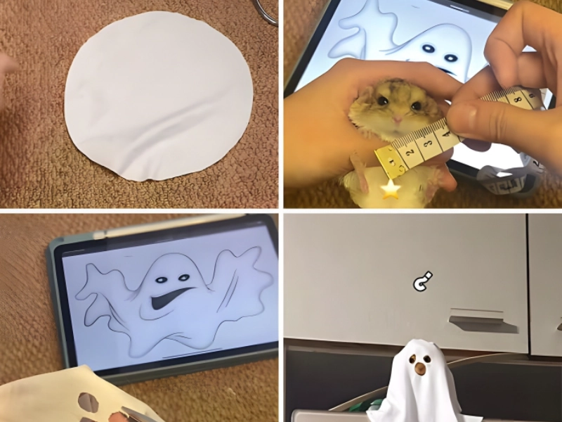Mit ein wenig Kreativität und einer Schere war der Geisterhamster geboren! Aber wir können uns des Eindrucks nicht erwehren, dass etwas fehlt. Hat jemand einen winzigen Kürbis herumliegen, den der Hamster tragen könnte?