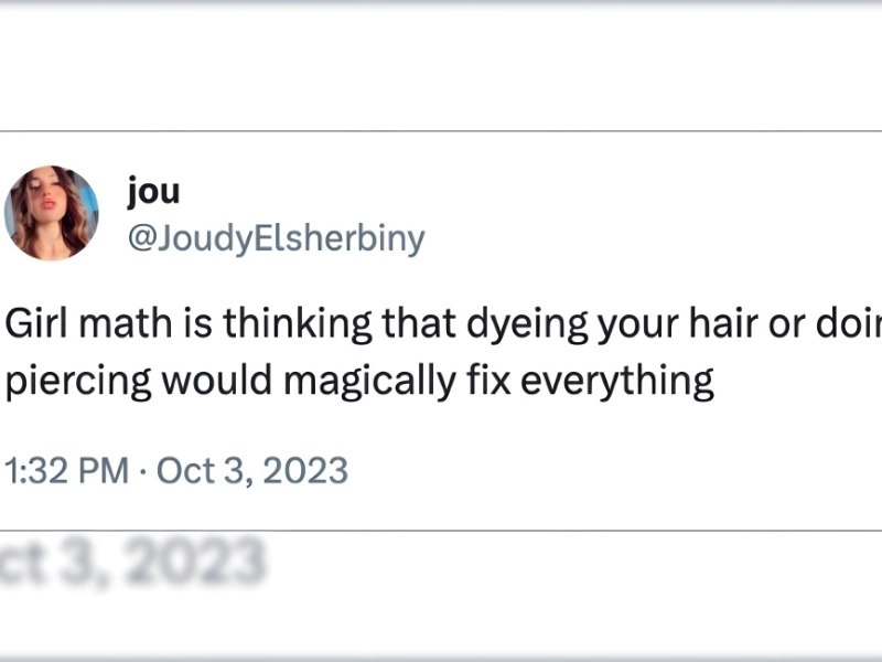 Girl Math: Glauben, dass eine neue Haarfarbe oder ein Piercing alles besser macht Quelle: @joudyelsherbiny Mit einem gebrochenen Herzen umzugehen ist nicht einfach, besonders wenn man die Regeln der Mädchenmathematik kennt und uneingeschränkten Zugang zu der Möglichkeit hat, sein Aussehen zu verändern. Diese beiden Faktoren vertragen sich nicht gut und führen fast immer dazu, dass Frauen sich das schmerzhafteste Piercing aller Zeiten stechen lassen oder sich in einer impulsiven Entscheidung alle Haare abschneiden.