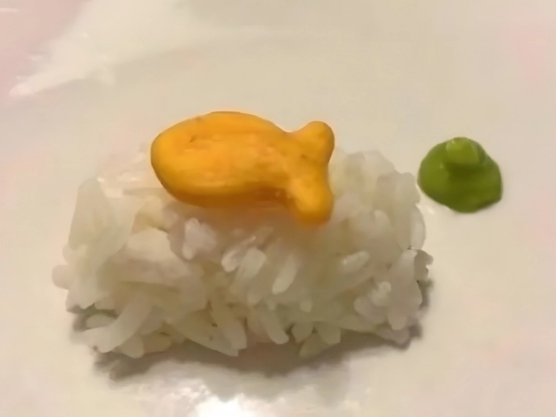 Die Bildunterschrift dieses Fotos beschreibt die Person als Sushi-Anfänger. Dieses Gericht besteht aus einem Klecks Wasabi, weißem Reis und einem Goldfisch obendrauf. Ist das Sushi? Nein. Ist es essbar? Ja, das ist es.