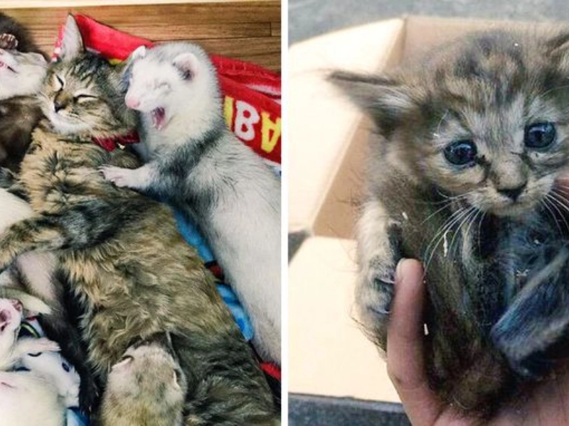 Tiny stray Komari arrived fragile and unsure but was immediately welcomed by a lively group of five male ferrets who treated her with gentle curiosity. Their playful tunnel chases and group naps became her social education. Believing herself one of the mustelid brothers, she copied their antics while adding her own feline grace. Even now, grown and confident, she seeks out their warm pile for afternoon naps, proving that family is built by love, not just biology.