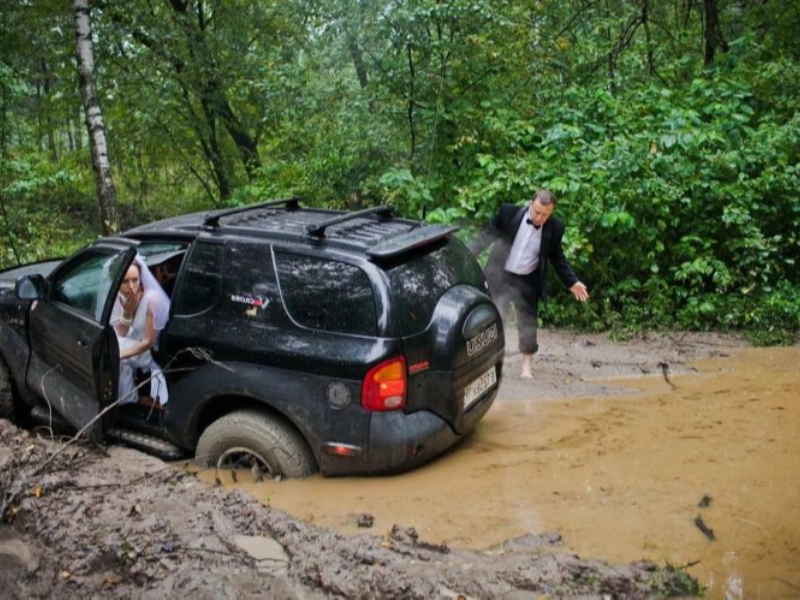 Suddenly, it is time to push the car! This unexpected event adds a real-life adventure to the wedding festivities.