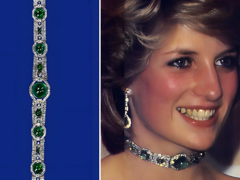 Porté par : Diana, Princesse de Galles Depuis : 1921 Valeur estimée : Inconnue La princesse Diana fut fréquemment photographiée par la presse britannique arborant le Collier d'Émeraudes de Cambridge, qui semblait être l'un de ses joyaux royaux les plus chers. Des années plus tard, Kate Middleton le portera à son tour lors de diverses fonctions royales.