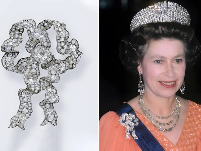 Portée par : Élisabeth II, la Reine Propriétaire depuis : 1932 Valeur estimée : 310 200 $* (pour le diamant principal) Après que le gouvernement sud-africain eut offert la pierre à la reine Mary en 1910, cette dernière acquit la Broche au Nœud d'Amour auprès de Garrard au début des années 1930. Elle la porta pour un portrait réalisé deux ans plus tard, accompagnée d'un sautoir, de boucles d'oreilles et d'un collier ras-de-cou en diamants (que la duchesse de Cambridge porte aujourd'hui en bracelet).