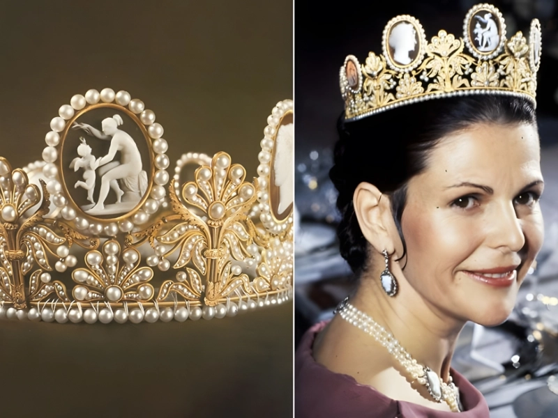 Porté par : La princesse Victoria Période de possession : 1805–1809 (la date exacte est sujette à débat) Valeur approximative : 2,31 million de $* Le Diadème à Camées est l'un des diadèmes de cette liste ayant la plus longue histoire. De nombreux membres de la famille royale l'ont porté, dont la princesse Victoria le jour de son mariage. Il existe depuis le début du XIXe siècle. L'impératrice Joséphine en fut propriétaire ; son époux Napoléon le lui fit réaliser durant les dernières années de leur union.