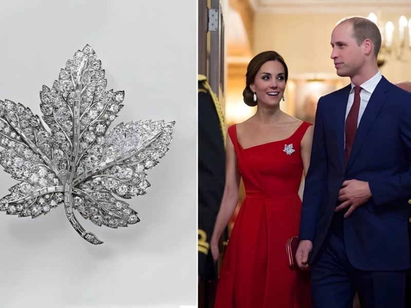 Portée par : Kate Middleton Propriétaire depuis : 1939 Valeur estimée : 1 à 2 million de $* La Broche à la Feuille d'Érable du Canada, l'une des plus grandes broches de Sa Majesté, appartenait à l'origine à la reine Élisabeth II et a été portée par Kate Middleton. Elle est taillée en forme d'érable à sucre, l'arbre national du Canada, dont la feuille est un symbole depuis 1868.