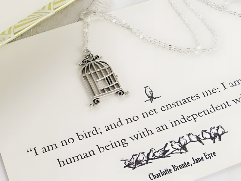 Un collier en hommage à Jane Eyre. La citation la plus célèbre du roman est : « Je ne suis pas un oiseau ; et aucun filet ne m'enserre : je suis un être humain libre, doué d'une volonté indépendante. » Elle résume parfaitement la personnalité de l'héroïne. Jane Eyre est admirée depuis longtemps par les femmes de tous âges.