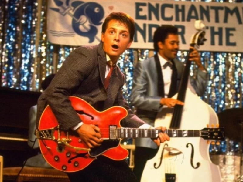 Dans la scène où ses parents célèbrent leur bal de promo en 1955, le héros principal joue en réalité sur une guitare Gibson ES-345… un modèle commercialisé à partir de 1958.
