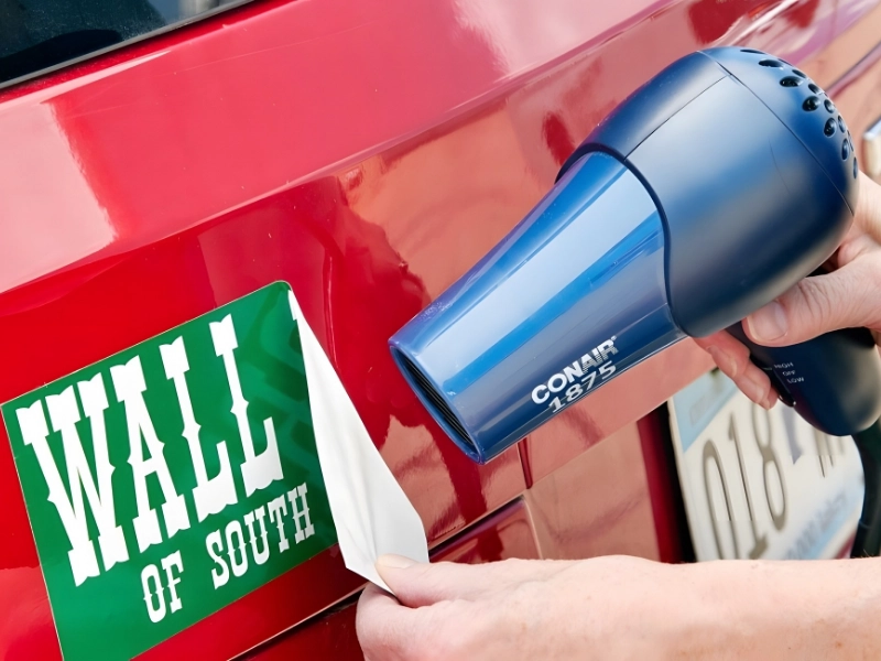 Pour commencer, utilisez un sèche-cheveux réglé sur la température la plus élevée. La chaleur est essentielle pour ramollir et faire fondre l'adhésif. Une fois l'appareil chaud, placez-le à environ quinze centimètres de l'autocollant. Cette distance concentre suffisamment la chaleur sans risquer d'endommager la peinture.