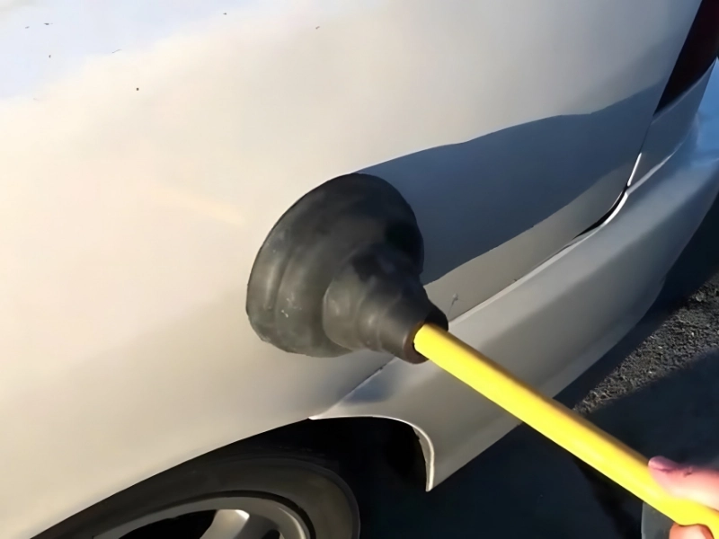 La première étape consiste à positionner la ventouse propre (du type utilisé pour les éviers ou toilettes) sur la zone bosselée. Assurez-vous qu'elle est exempte de saletés pour ne pas rayer la carrosserie.