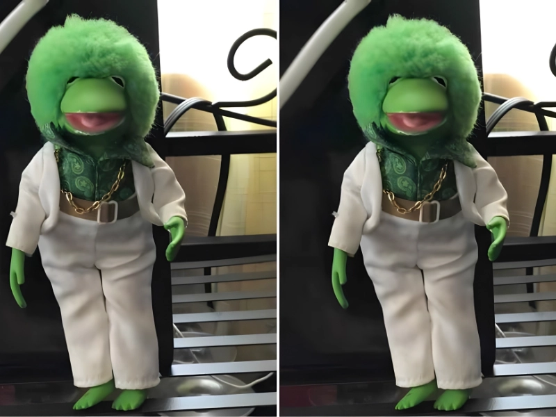 Lieu de trouvaille : Inconnu. Valeur approximative : Non communiquée. Cette poupée Kermit fait partie de ces images que l'on trouve parfois et que l'on peut presque entendre. Ce Kermit semble impatient de vous inviter à faire un tour en discothèque comme si de rien n'était, avec sa tenue et sa coupe de cheveux disco complètes.