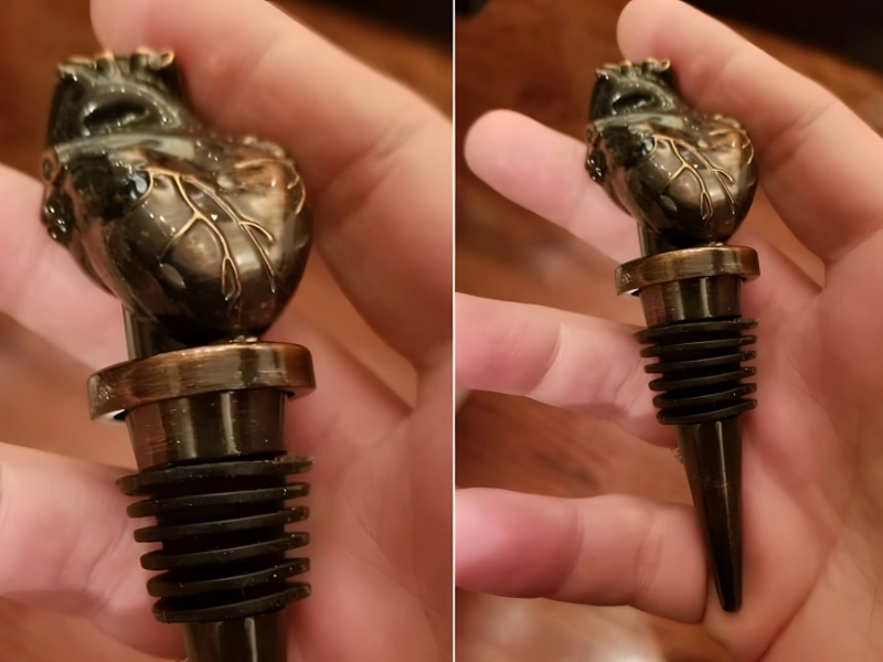 Lieu de trouvaille : Inconnu. Valeur estimée : 25 $. Bien que les bouchons de vin existent dans une variété de tailles et de formes, ils ne sont généralement pas aussi élégants que celui-ci. Une infirmière a découvert cette pièce dans une friperie non identifiée. Bien entendu, elle a dû l'acheter. Cette reproduction en bronze d'un cœur humain ne plaira peut-être pas à tout le monde, mais elle ne manquera pas de susciter la conversation parmi les invités à dîner.